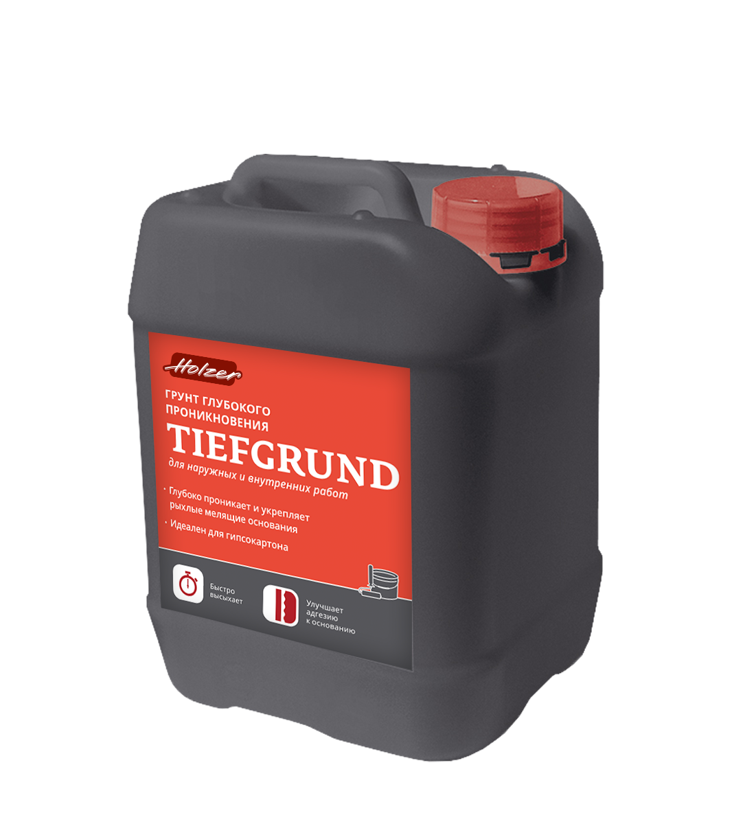 Грунт Хольцер Тифгрунт предназначен для укрепления и обеспыливания мелкопористых, слабых, рыхлых мелящих оснований. Применяется для уменьшения и выравнивания впитывающей способности таких минеральных оснований как гипсокартонные и гипсоволокнистые листы, бетон, кирпич, шпатлевка или штукатурка на цементной или гипсовой основе.