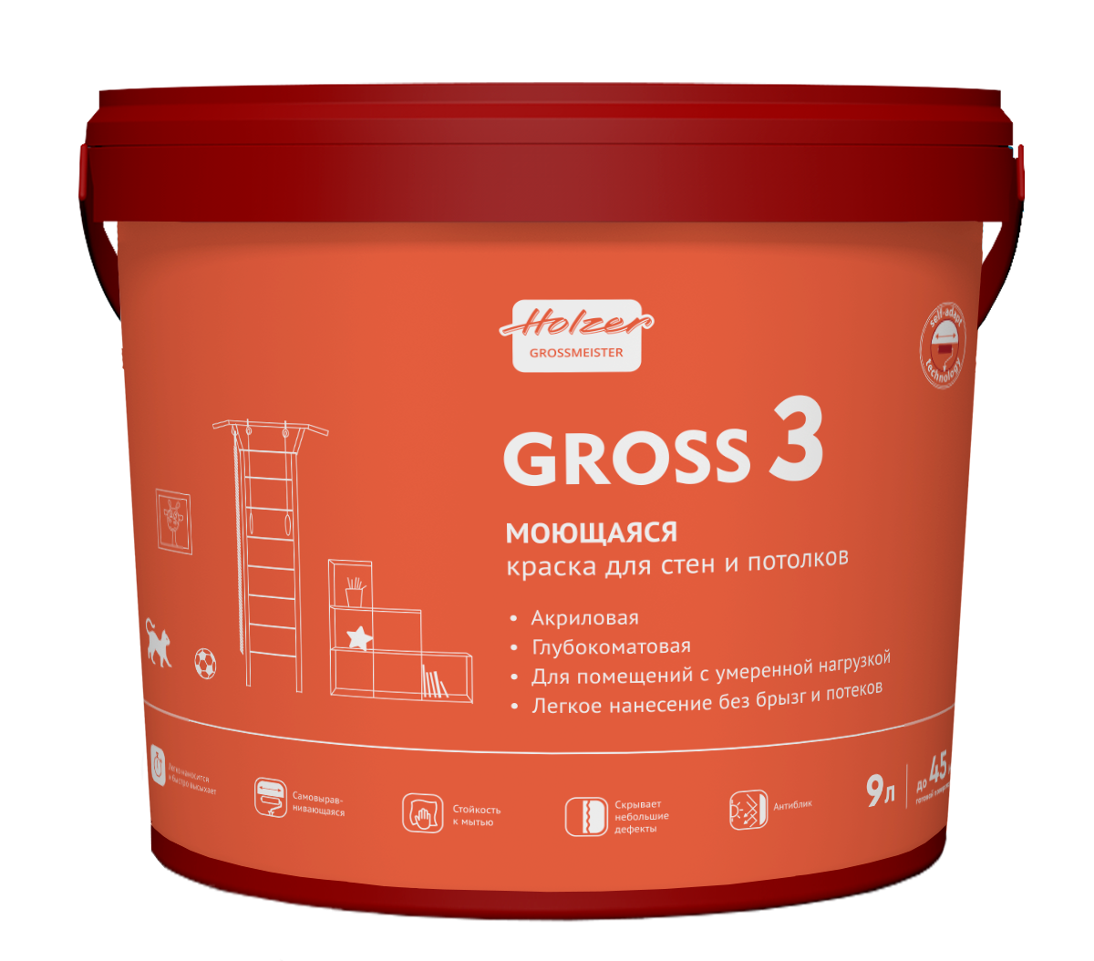 Глубокоматовая интерьерная латексная краска. Устойчива к мытью без моющих средств.