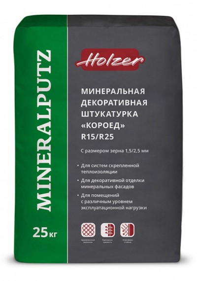 Минеральная декоративная штукатурка Хольцер Минералпутц применяется в качестве декоративного покрытия для систем фасадных теплоизоляционных композиционных, минеральных фасадов зданий, стен внутри помещений.