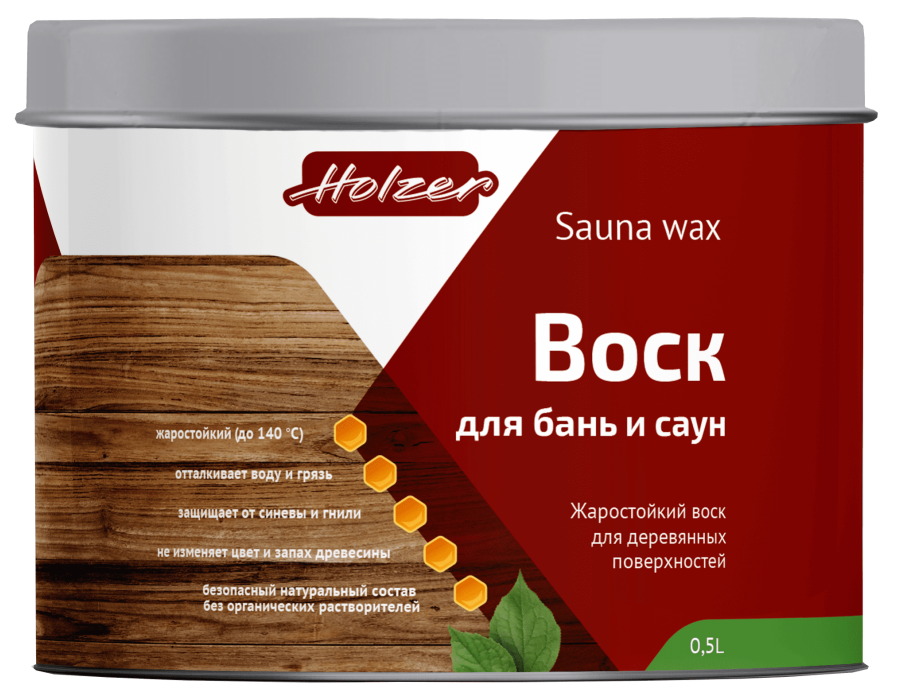 Воск HOLZER Sauna wax – средство из натуральных восков и масел для обработки деревянных элементов и поверхностей в парных, банях и саунах, в том числе для обработки полков, панельных стен, потолков, дверей и оконных рам с целью создания водоотталкивающего жаростойкого покрытия. Может использоваться в качестве самостоятельного или дополнительного износоустойчивого покрытия для пола, лестниц, элементов декоративной отделки и предметов мебели и антиквариата, а также игрушек, столешниц и рабочих поверхностей. Не изменяет естественный цвет древесины (в т.ч. термообработанной)